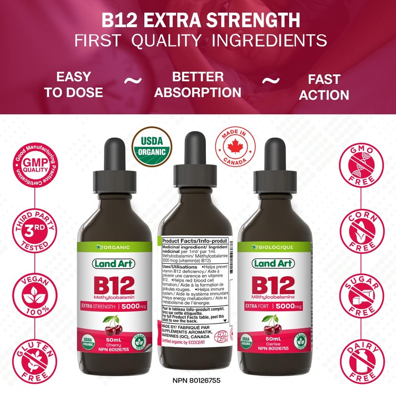 Land Art Certified Organic Vitamin B12 5000mcg Drops, Methylcobalamin, 50 Servings C Land Art - Vegan - Sugar Free C Maximum Absorption C Made in Canada