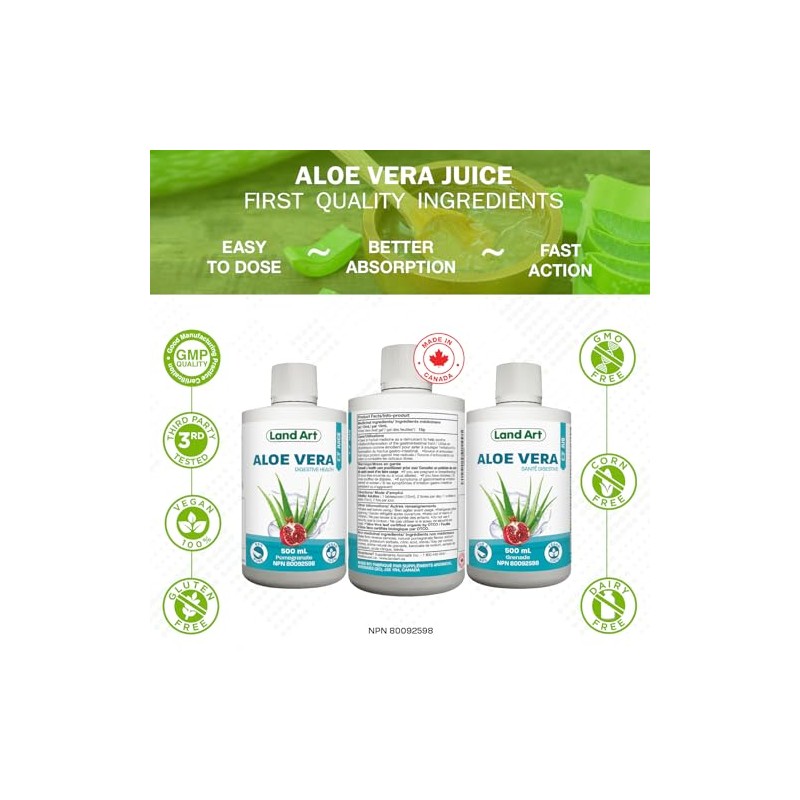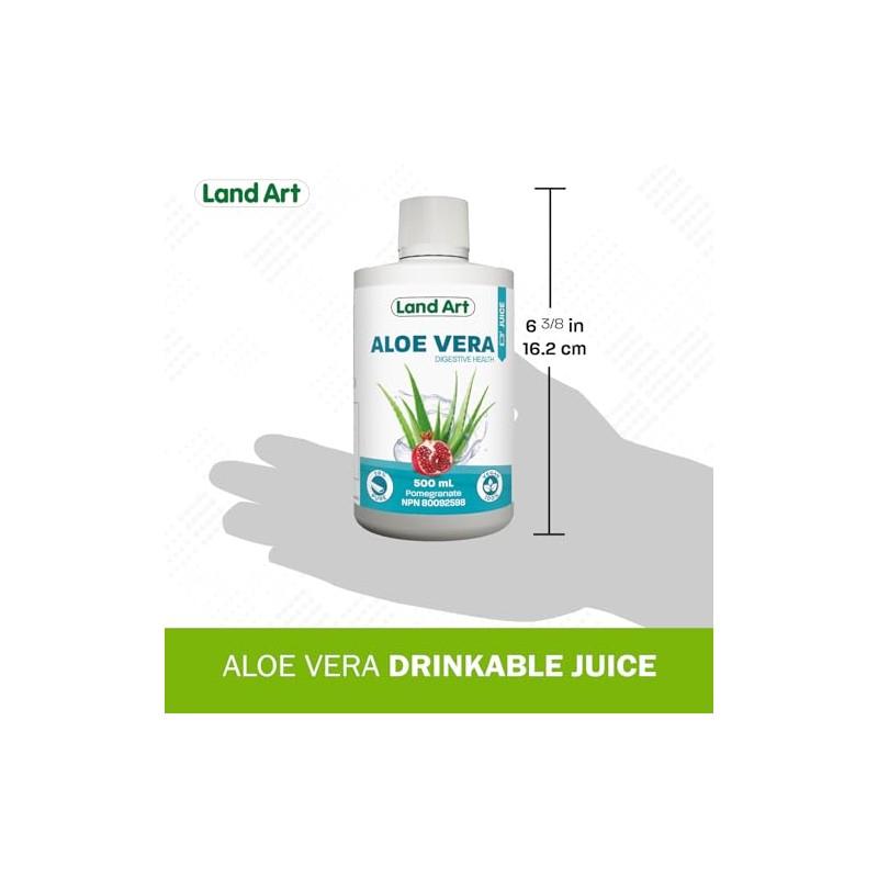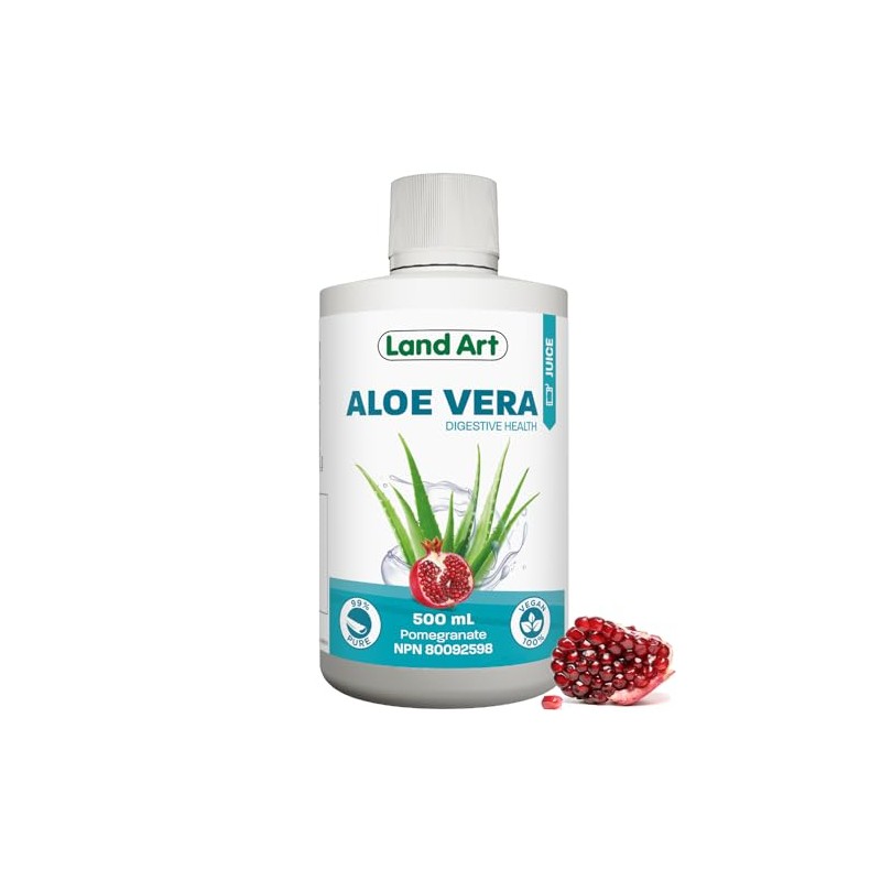 Land Art Pure Aloe Vera Juice Pomegranate 500 ml - Cold-Processed C from Organic Fresh Leaves C for Intestinal Issues C Made In Canada