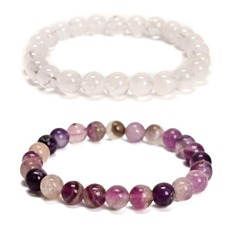 Land Long 2Pcs 6mm Real Rainbow Fluorite+Clear Quartz Crystal Double Protection Bracelet Set-Round Stone Beaded Bracelets for Women Men