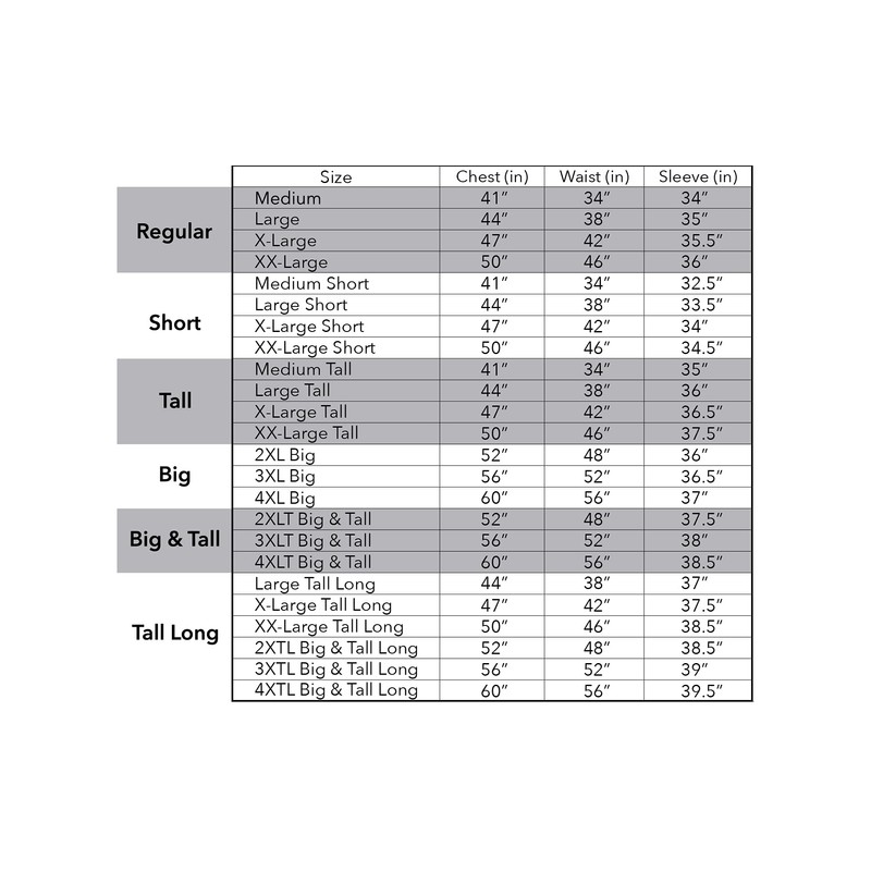 - Approx. length from shoulder: regular 32.5"; tall 34"; big 34.5"; big & tall 36"