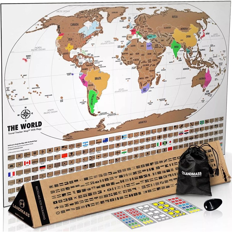 Landmass Scratch Off Map Of The World - Premium World Map Poster with Flags - Deluxe T...