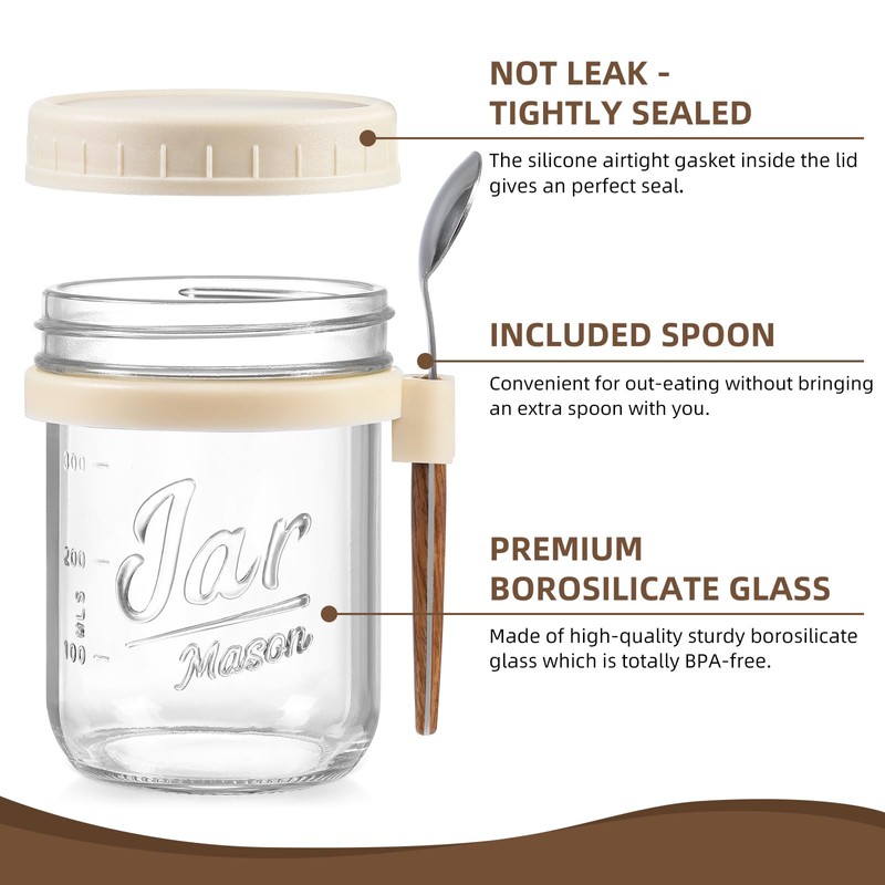 LANDNEOO 6 Pack Overnight Oats Containers with Lids and Spoons, 16 oz Glass Mason Overnight Oats Jars, Large Capacity Airtight Jars for Milk, Cereal, Fruit(Beige
