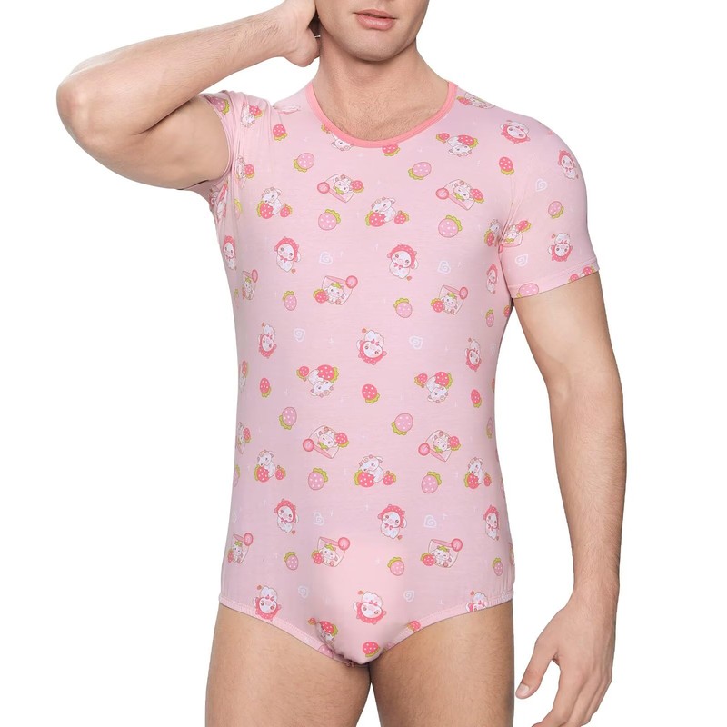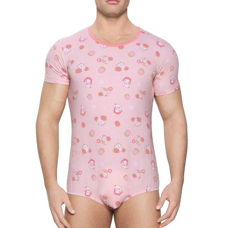 Landofgenie Mens Onesie Short Sleeve Bodysuit Print Rompers One Piece Pajamas - Strawberry Cow M