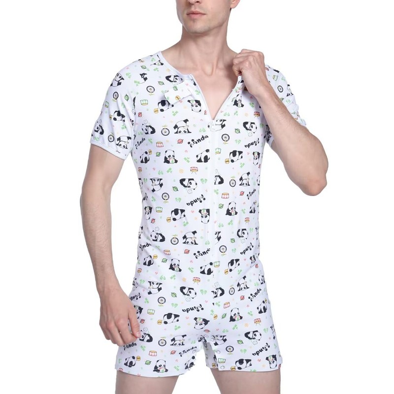 Landofgenie Mens Short Sleeve Onesie Snap Crotch Print Romper One Piece Pajamas for Men -Panda White