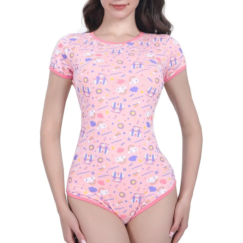 Landofgenie Women's Bodysuit Short Sleeve Cotton Onesie Pyjamas Bodysuit One Piece Romper, pink