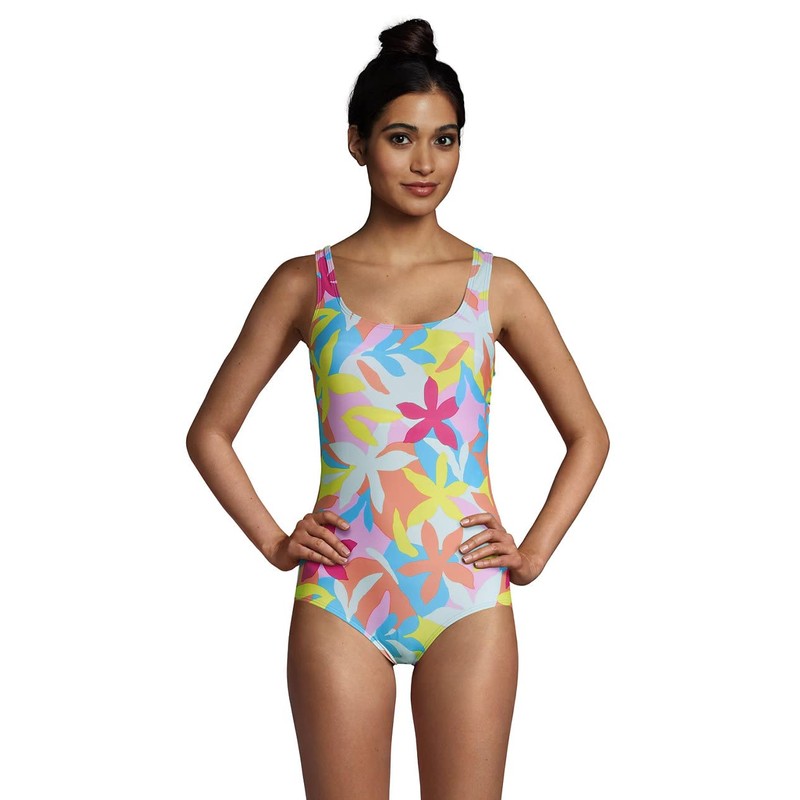 Lands' End Womens Chlorine Resistant Tugless Tank Soft Cup One Piece Swimsuit Turquoise Multi Graphic Floral Petite 4