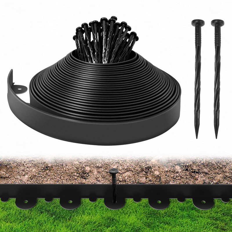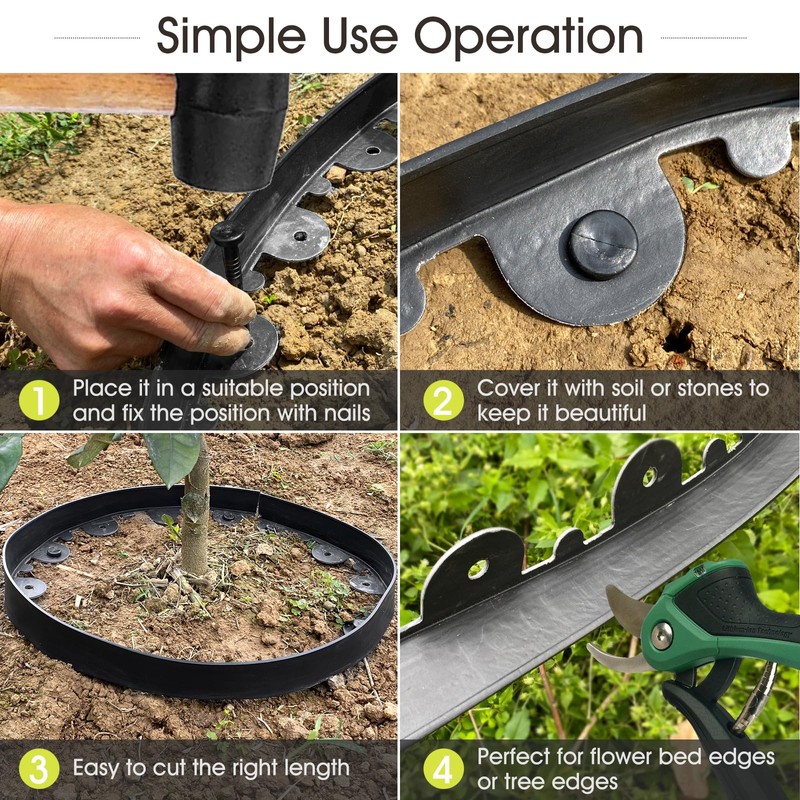 - Easy installaion:No dig landscape edging are simple to install. Just hammer these spikes into the ground to reinforce the shape to prevent warping.This plastic lawn edging is easier to trim to any length to separate garden flower bed areas than metal garden edging! It won't rust and will keep the garden looking good for a long time.