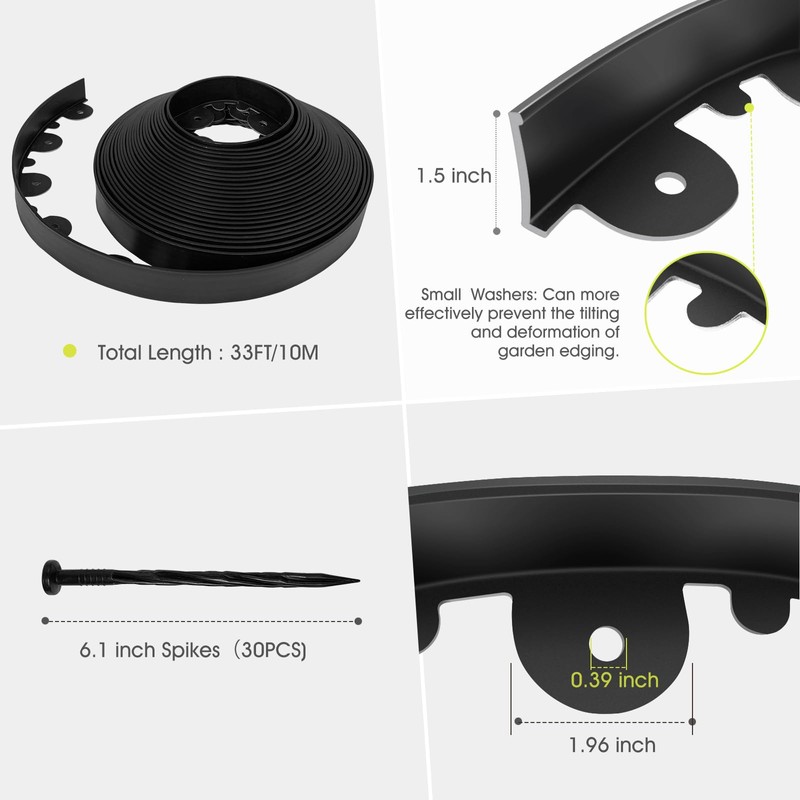 - Garden border edging size: The landscape edging has a total length of 33 ft and a height of 4 inches.It comes with 30 landscape spikes, suitable for making garden DIY, such as paths, lawn, vegetable garden,flower beds or tree circles. Ours has one more small spacer than regular garden edging, which can be more stable and less prone to flipping and tipping.