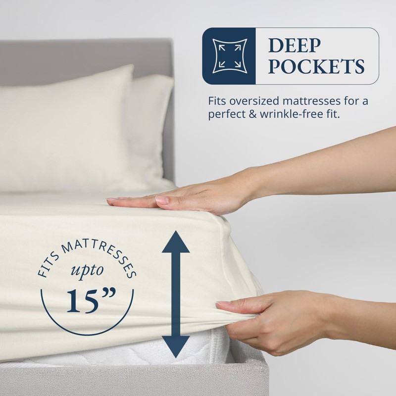- Cozy as a Hug: Feel the embrace of a secure fit like never before! Our deep pocket full size fitted sheet features all-round elastic, fitting mattresses up to 15" deep. No more struggling with corners – just pure, comfy coziness.