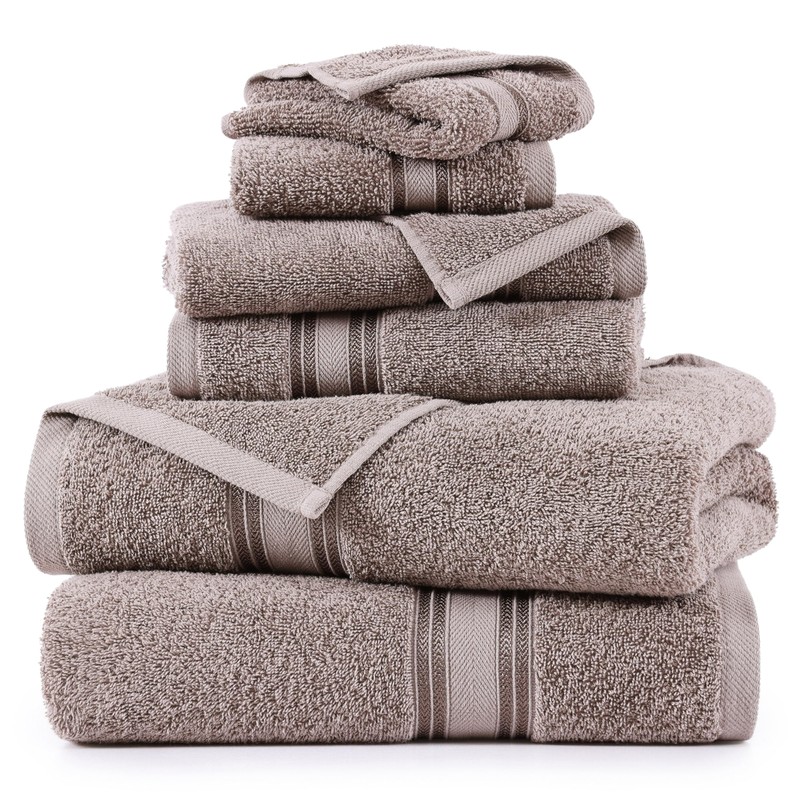 - Each 6 Piece Towel Set includes : 2 Bath Towels - 28" x 54" , 2 Hand Towels - 16" x 28" and 2 Wash Cloths - 13" x 13". Crafted from premium Cotton, each bath towel, hand towel, and wash towel promises to be soft on your skin to keep you warm and dry after you step out of the shower.