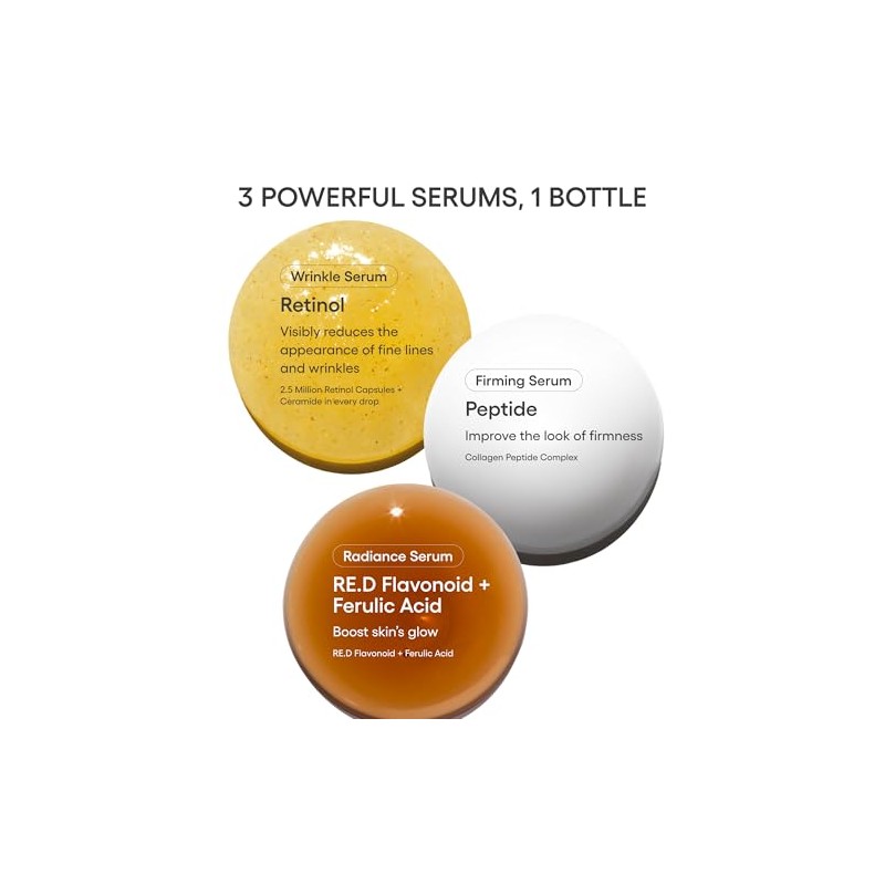 - Three gentle serums target skin three ways to improve fine lines, firmness, & glow. The unique triple chamber packaging blocks out light to help keep the formulas fresh & potent while they are not in use.