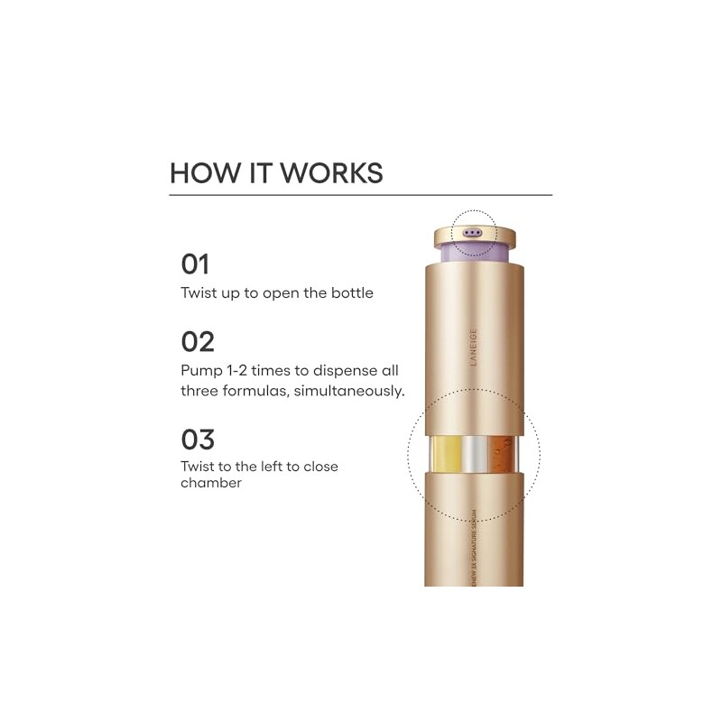 - Suggested Use: Twist the bottle up from the mid-section to open. Pump - times to dispense all three formulas simultaneously. Apply onto face AM & PM.