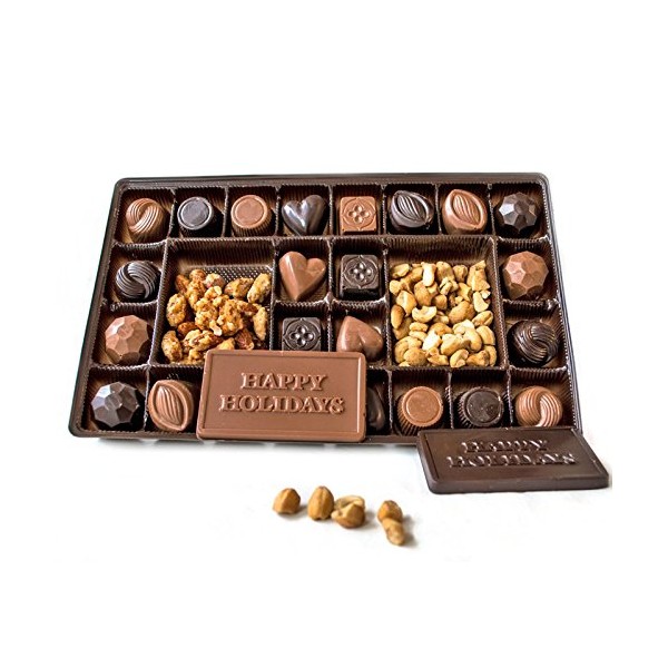 Who doesn't crave a bit of chocolate? Our Chocolate Sampler Holiday Box is the perfect way to celebrate Christmas or Chanukah! Also, great as corporate holiday gifts or employee incentives. Seriously good creamy milk chocolates, deep dark Belgian chocolates, caramels and more, this box gives a huge sampling of decadent and luxurious hand-crafted chocolate treats. What's in the Box: Chewy caramels Crunchy cashew clusters Creamy peanut butter cups Sweet and salty peanut clusters Rich and creamy solid "Happy Holiday" bars Super decadent meltaways Sweet chewy raisin clusters Buttery Toffee Almonds Delicious salted cashews Avaiable in a 1lb box of 26 pieces or a 2lb box of 52 pieces Our Chocolate Sampler Holiday Box is Certified Kosher-Dairy 73% Cocoa Belgian Dark Chocolate