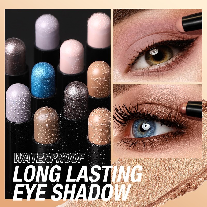 - WATERPROOF & LONG-LASTING: The pigmented eyeshadow sticks stay put all day and withstand humidity, tears, and sweating for color that doesn't crease or fade.Each pen boasts a soft, creamy texture that's easy to blend and suitable for everyone. The understated shimmer gives a natural look while letting you build the intensity as needed.