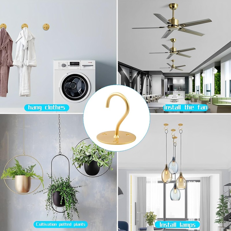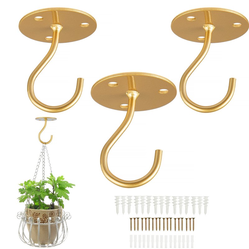 Ceiling Hooks for Hanging Plants-Metal Heavy Duty Wall Mounted Hangers for Hanging Bird Feeders, Planters, Wind Chimes, Include Professional Drywall Anchors (3-Pack) (Gold)