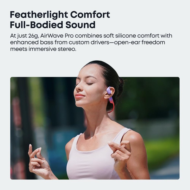 - Ultra-Light 26g Build with Skin-Friendly Silicone for All-Day Comfort - AirWave Pro features a memory titanium alloy frame wrapped in soft, skin-friendly silicone. This combination ensures a secure yet gentle fit, reducing pressure on the ears for long-lasting comfort during extended wear.