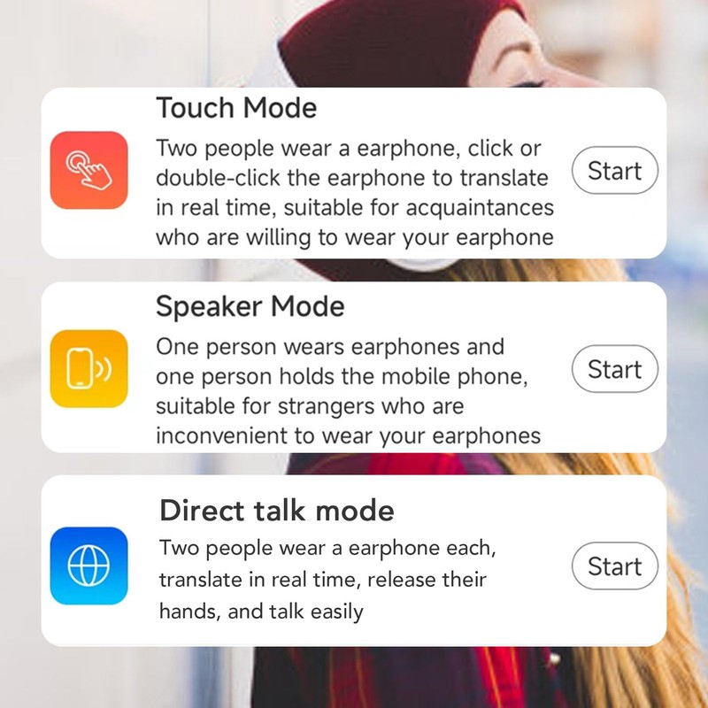 - [Three Translation Modes] You can choose from three modes: Touch Mode (for chatting with acquaintances), Speaker Mode (for conversing with strangers), and Freely Talk Mode, catering to various scenarios.