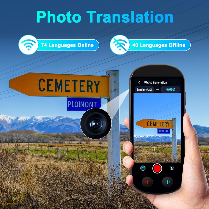 - 📱【High-Resolution Image Translation】: With a 6-megapixel camera and OCR technology, the translation device enables the quick translation of signs, menus, magazines and more into 74 languages. In addition, it supports audio recordings of up to 60 minutes in different languages.