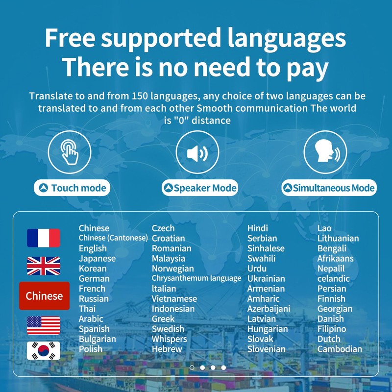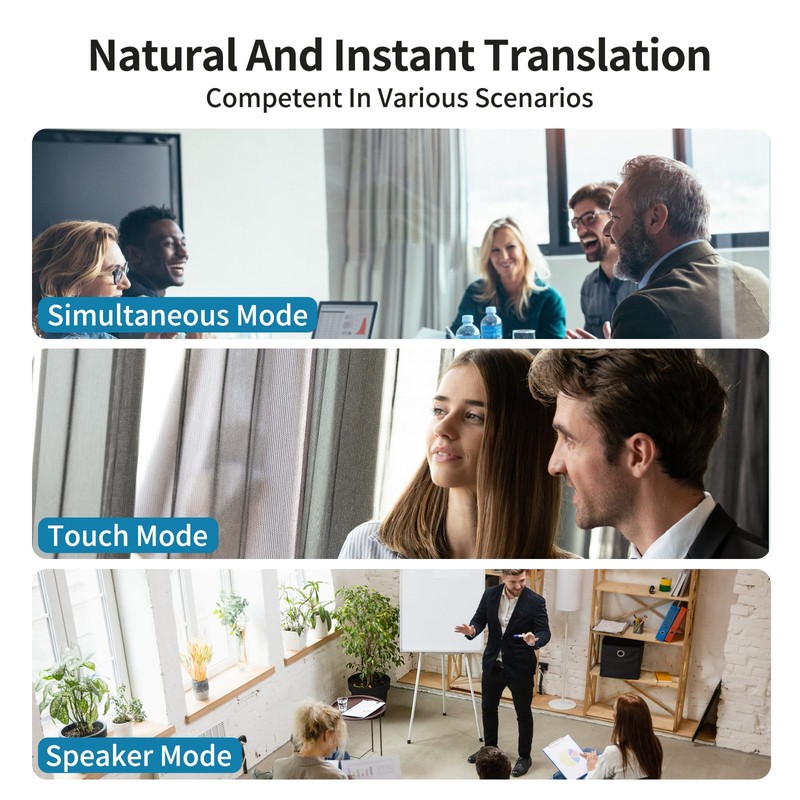 - Multiple translation modes (touch mode, external mode, free speech mode).