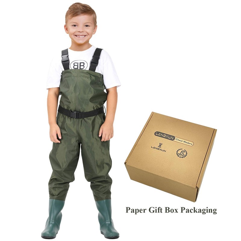 - DURABLE, WATERPROOF, SKIDPROOF - LANGXUN fishing waders use high quality nylon fabric, it is about 2 times higher than common nylon in every square inch. It makes the wader more durable and also improves its waterproof performance. Even if kids wear them for a long time in cold weather, they can keep their body dry and warm. High quality anti-slip rubber boots provide extra support and a snug fit, stopping any slipping in the mud and a reinforced heel protector helps support and protect your chi
