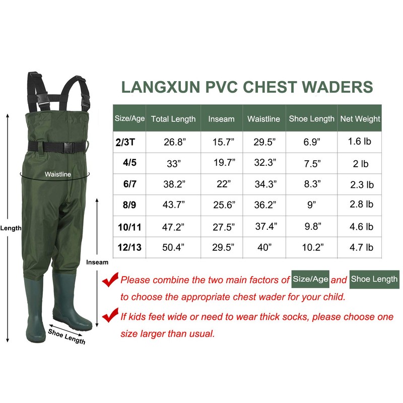 LANGXUN Chest Waders for Kids, Lightweight and Breathable PVC Fishing Waders for Toddler & Children, Waterproof Hutting Waders for Boys and Girls, Age 2-13 (12/13 Year Old Big Kid)