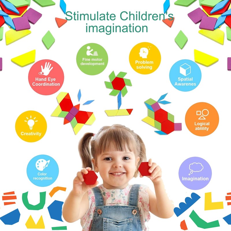 2. These wooden pattern blocks provide children with a creative and fun way to explore and analyze geometric shapes. Stimulate children's imagination and creativity. Encourage early recognition of shapes, colours and numbers.