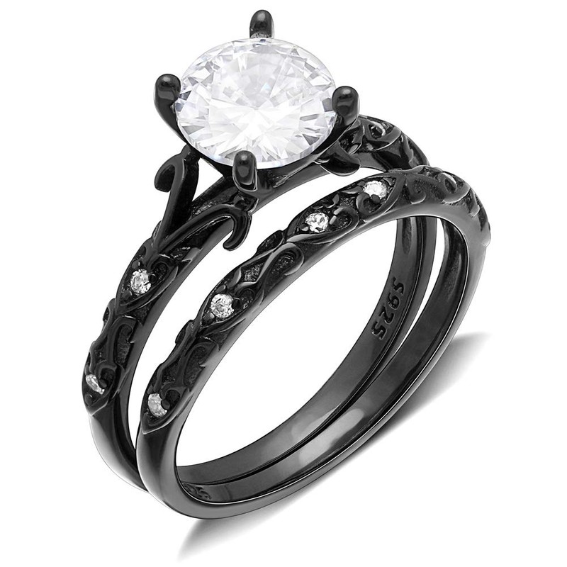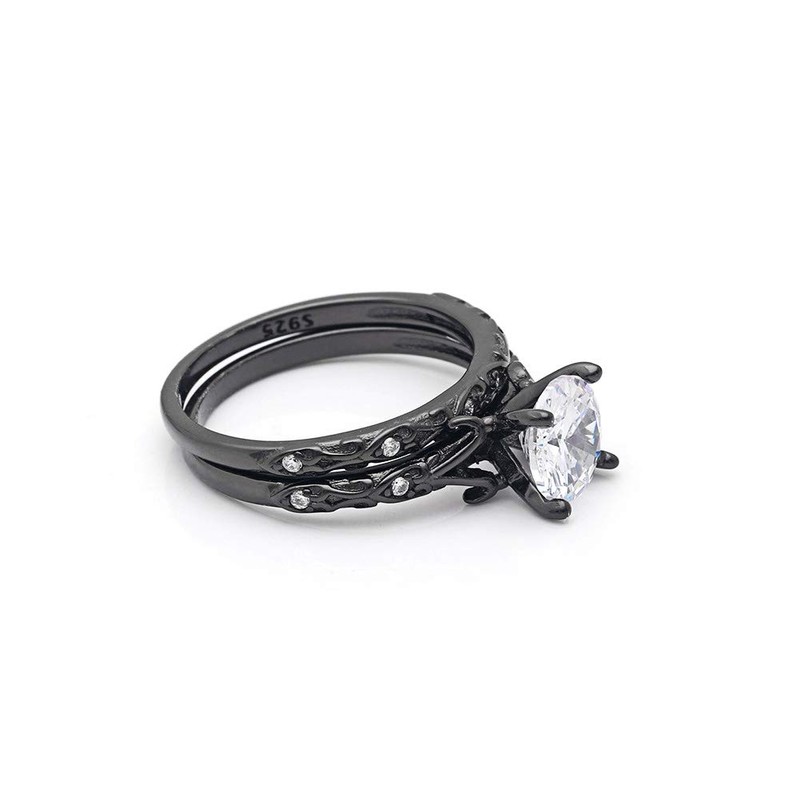 Lannelle Black Wedding Ring Set for Women by Ginger Lyne | Solitaire 1.25 Carat Engagement Ring with Matching Band for Her | Sterling Silver Unique Vine Setting Black Tie Series Bridal Jewelry