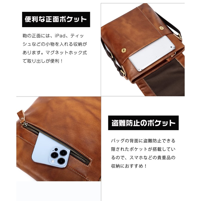 - 【Convenient accessory pocket】: The front of the leather shoulder bag for men has storage for small items such as iPad, tissue, etc. There is a zippered pocket on the back to prevent theft, so you can store your valuables such as your phone