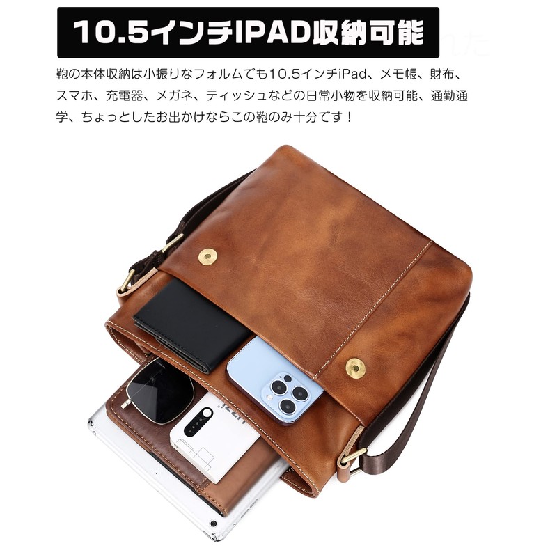 • Genuine Leather Shoulder Bag for 10.5-inch iPad: The main body of the genuine leather bag is small but it can store daily accessories such as 10.5-inch iPad, notepad, wallet, smartphone, charger, glasses, tissues, etc. This bag is only enough for commuting to work or school, shopping, outdoor activities, walking around town, or just going out