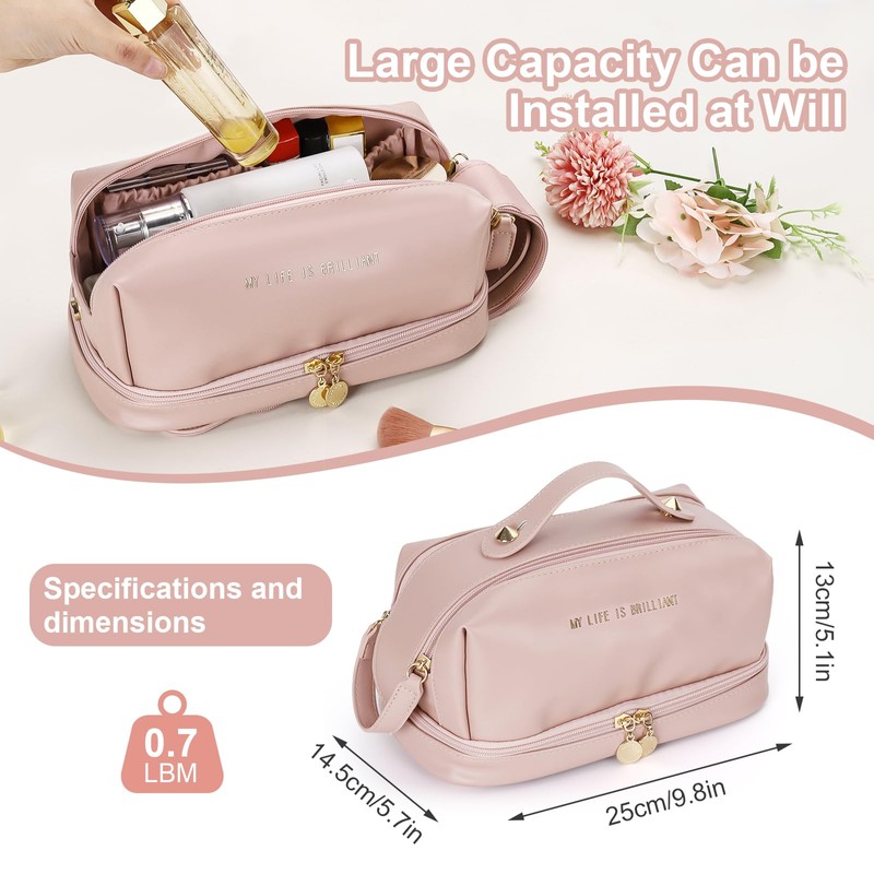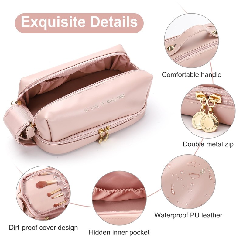 • Features: large capacity and unique double-layer design. The durable double hardware zip, the handle design on the top and comfortable side handle made of leather is comfortable for you, this women's toiletry bag makes it easy to take anywhere. Size: 25 cm x 14.5 cm x 13 cm, weighs only 320 g.