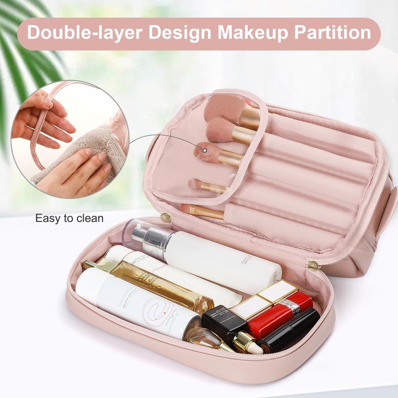 • Perfect design: this double-layer make-up bag is divided into top and bottom shelves, total has 3 pockets and 2 compartments. The large compartment fits enough space for all your cosmetics and skin care products. The inner pockets on both sides have elastic bands to sort and store, the other layer has a divider and slots for makeup brushes with a PVC cover.