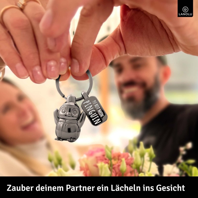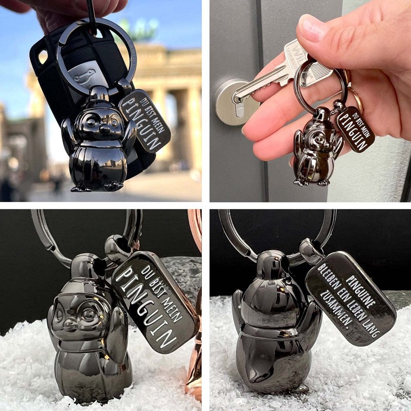 - Metal key ring with 3D penguin pendant: Platschi is made of solid metal and gives a high-quality and beautiful feeling when holding in the hand. The keyring with engraving on both sides is a cute pair of key rings luck.
