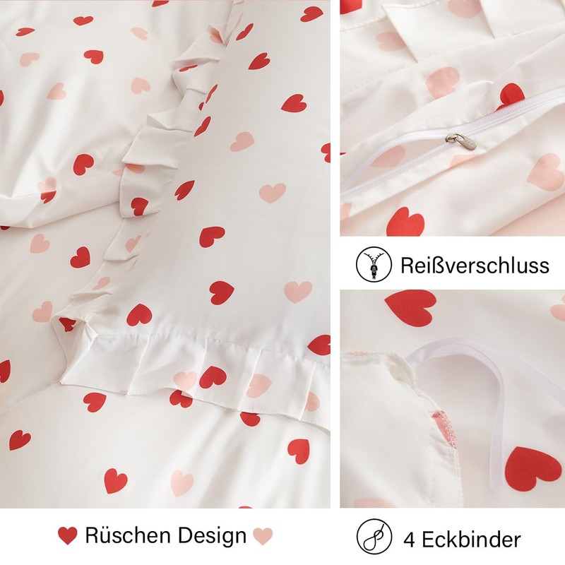 Lanqinglv Ruffle Bed Linen 135 x 200 cm Pink Red Hearts, Aesthetic Hearts Reversible Bedding Set, Oeko-Tex Bed Linen for Allergy Sufferers, Romantic Duvet Cover with Zip and Pillowcases 80 x 80 cm