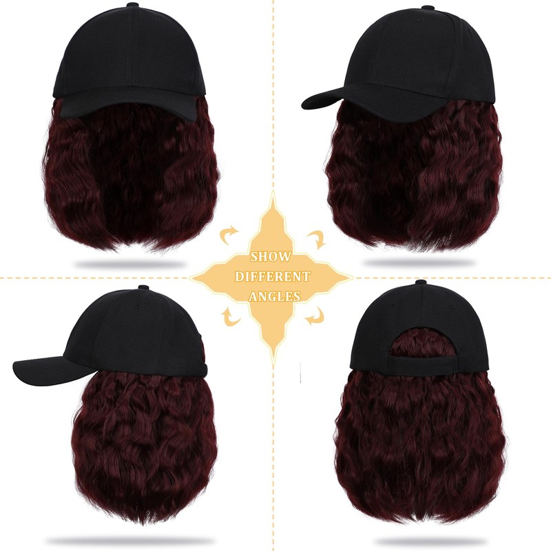 Lansigreen Baseball Cap with Hair Extensions Hat Wig Adjustable Hat Attached Curly Wave 14" Synthetic Hairpiece for Women Grape Red