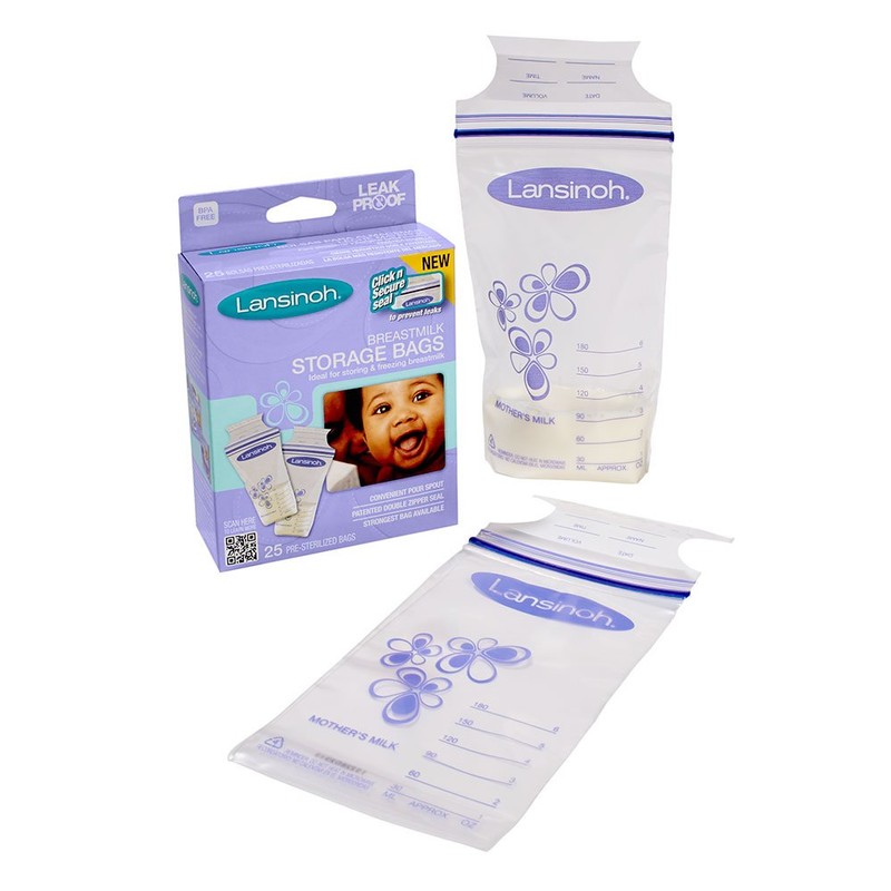 Expressing breast milk from work takes a lot of time and dedication, so anything that will make the process easier is appreciated by moms. Storing milk in bottles takes up valuable freezer space and means that you have to keep purchasing more and more bottles to build up your stash of food for baby. These plastic breast milk storage bags come pre-sterilized, and are easy to carry around--as theyre not much bigger than a travel pack of tissues. In fact, they come in a tissue-style dispenser, making them easy to access and store. Each bag stores up to 6 ounces, or 180 milliliters of milk, and seals tightly to preserve freshness. Bags lay flat in the freezer saving plenty of space for more milk or other foods. Milk transfers easily from bag to bottle with no spillage. A tab above the fill area lets you write the express date, volume of milk, and the name of your child (in case you are handing it off to a busy daycare provider for feedings) on the bag without worry that you may puncture and contaminate your milk with ink. For moms who have to temporarily store their milk in a busy office refrigerator, a tamper-evident safety seal on each bag informs you if someone has been in your supply. Each box includes 25 storage bags. _\--Cristina Vaamonde_
