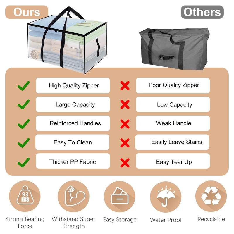- 【Large capacity】 The moving bags heavy duty is 28.7*14.1*13.9 inches/73*36*35.5cm, with a capacity of 93 liters, which is suitable for storing quilts, blankets, pillows, toys, jackets or other seasonal clothes.