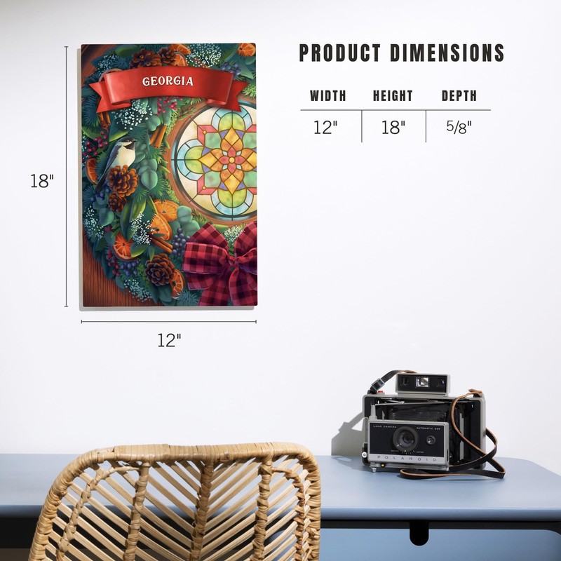 - 12 x 18 x 5/8 inch, Lantern Press 12x18 Inch Premium Wood Sign, Ready to Hang Wall Decor, Georgia, Front Door with Christmas Wreath