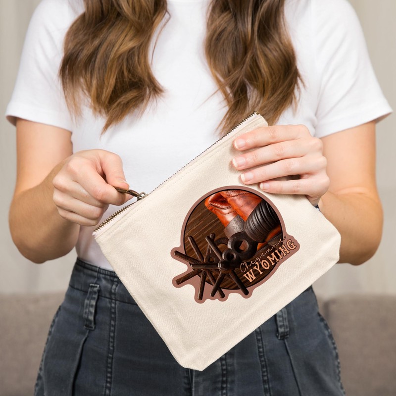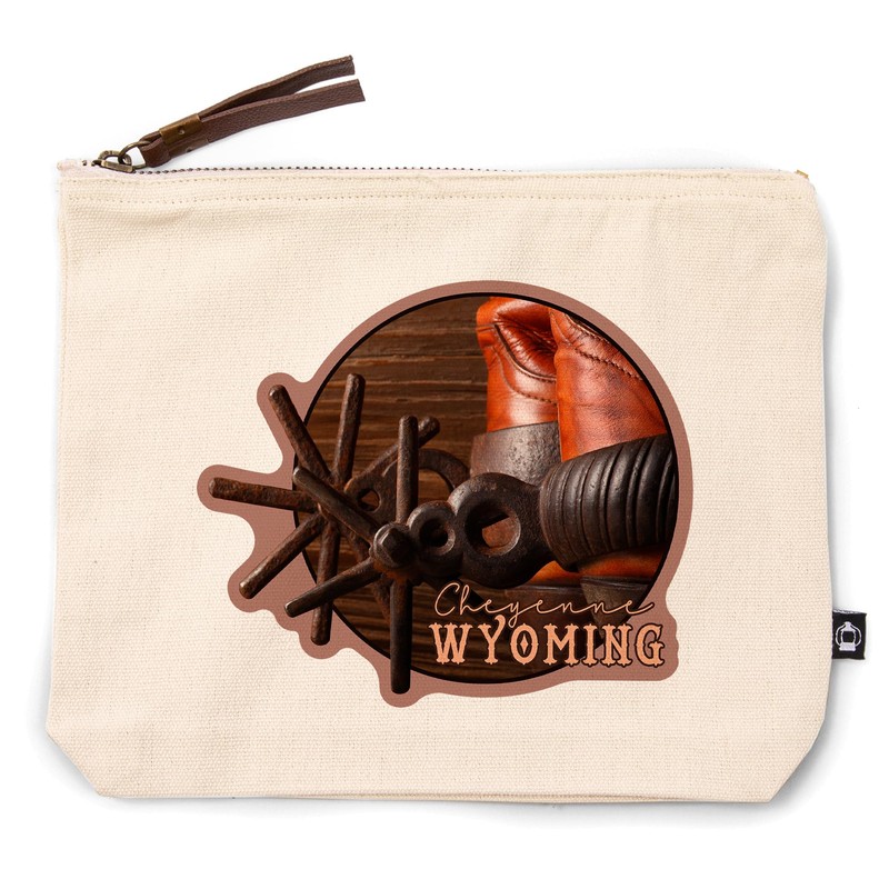 - Cheyenne, Wyoming, Cowboy Boots and Spurs, , 100% Cotton Zipper Pouch, Travel Accessory, Go Bag, Size of 7.25 x 9 inches.