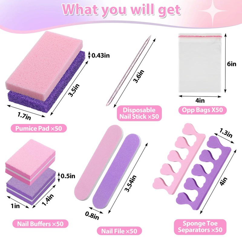 - Disposable Pedicure Kit: unmatched in value, this pedicure kit includes 50 pairs of toe separators, 50 foot pumice stone, 50 nail files, 50 mini buffer, 50 cuticle pusher, and 50 self-adhesive bags. The kit is fully equipped, convenient to use, disposable, and hygienic