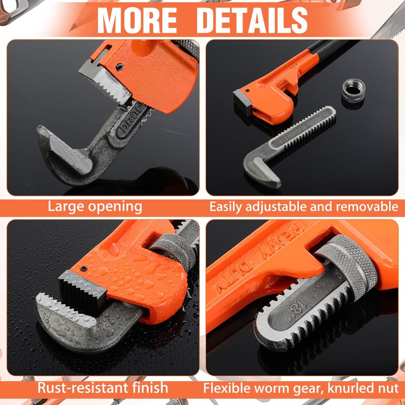 Comprehensive Tool Set: with 6 different sizes ranging from 8 inches to 24 inches, this pipe wrench set offers a comprehensive range of tools suitable for various tasks and applications. Whether you're tackling a small home plumbing repair or engaging in extensive professional pipeline work, this versatile set ensures you always have the right size wrench at your disposal for maximum efficiency and convenience