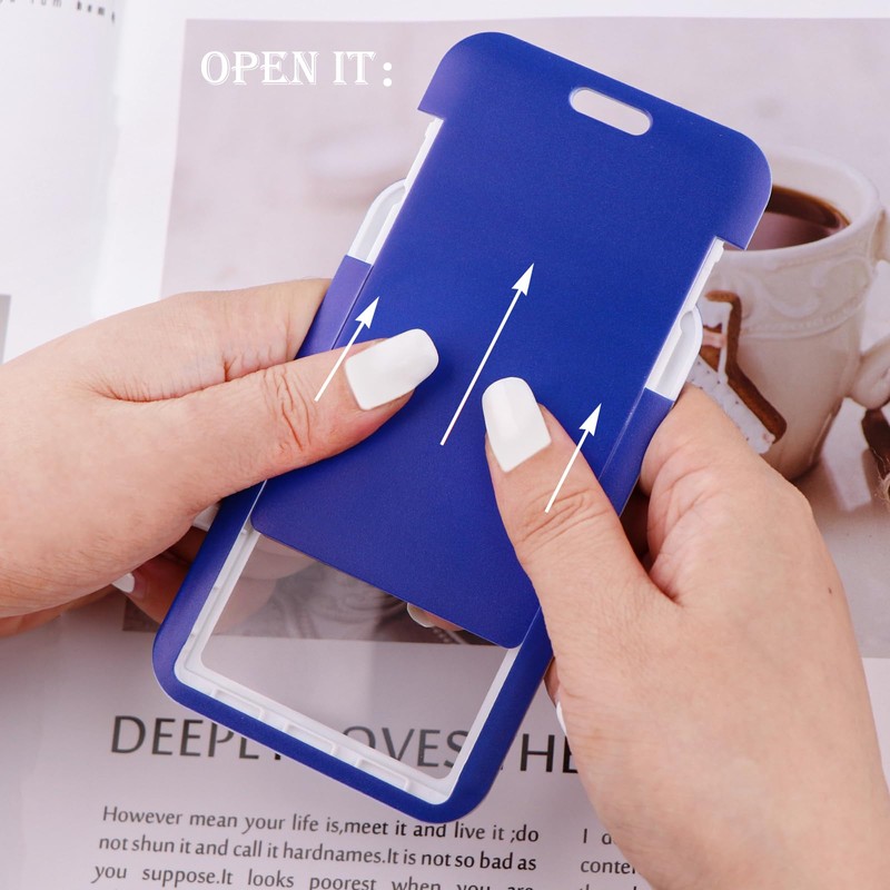- Badge Holder Cover: The hard protector ID Holder keeps your important card badge secure and works for scanning. Easy to insert and remove ID card: push the back to slide up like open a window. It holds 2 RFID or Standard ID Credit Card