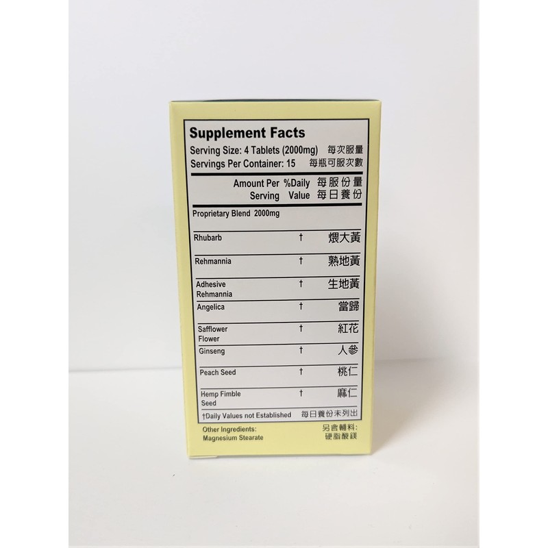 Ingredients: Rhubarb, Rehmannia, Adhesive Rehmannia, Angelica, Safflower Flower, Ginseng, Peach Seed, Hemp Fimble Seed.