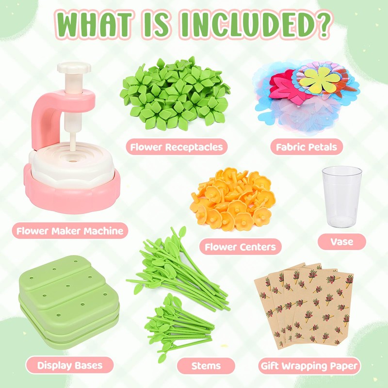 - Rich Accessories: Flower Bouquet set including flower maker machine, colorful fabric petals, flower centers, flower receptacles, long flower branches, short flower branches, display bases, vase, bouquet wrapping paper and Double-Sides tape. Hurry up and make beautiful bouquets for yourself, your family and friends with Flower Maker!