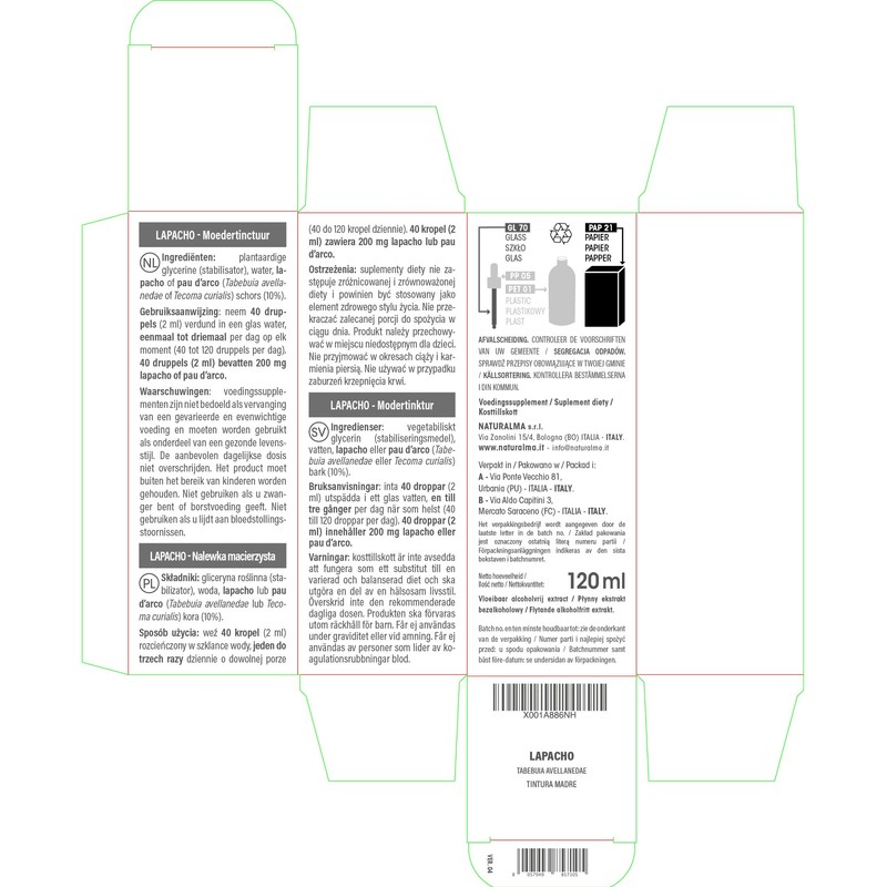 - Lapacho or Pau d'arco (Tabebuia avellanedae or Tecoma curialis) bark mother tincture concentrated 1:10. 100% natural, alcohol free, no added sugar. Reported to the Italian Ministry of Health. Made in Italy.