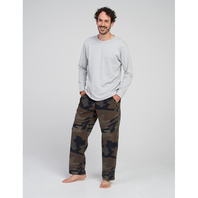 LAPASA Men's Fleece Pajama Set Top Bottom Pants Plaid Shirt Long Sleeves Sleepwear Pocket Lounge Nightwear PJ Warm Cozy M129 Medium (Cotton Top+fleece Bottom) Light Heather Gray + Green Camouflage