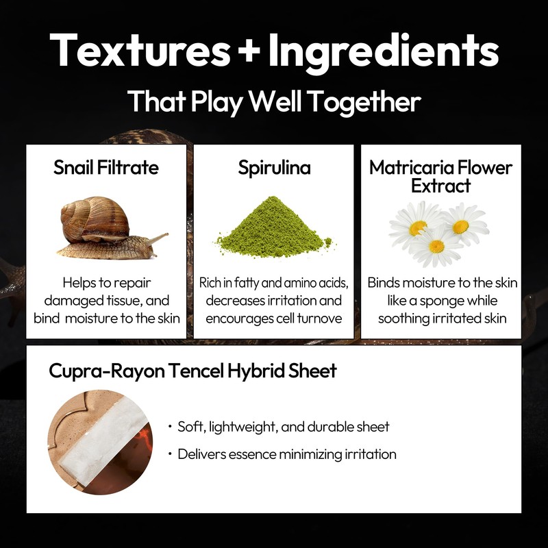 - REGENERATING SNAIL SKINCARE - Our Escargot cupra rayon and tencel sheet mask, rich in revitalizing benefits, helps to reverse environmental damage for a youthful complexion