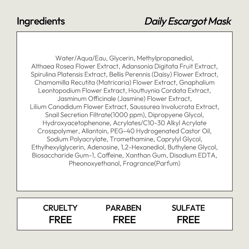 - NATURAL RESTORATIVE MASK - The beauty secret is Snail extract, which nourishes skin for a satisfied complexion. Packed with nutrients such as hyaluronic acid, glycoprotein, proteoglycans and more