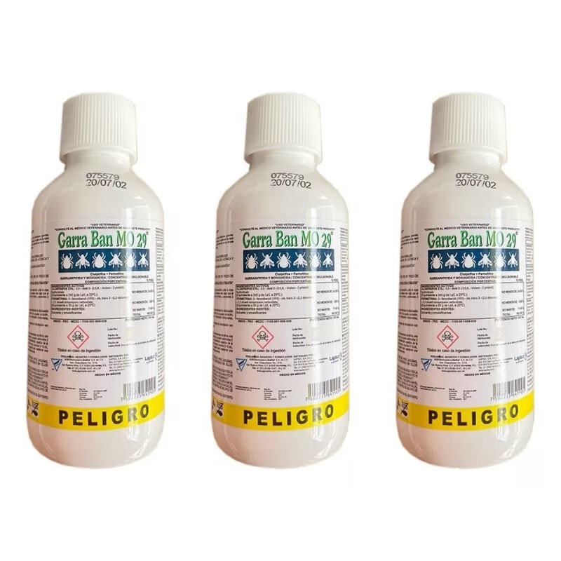 3 Garraban 100 Ml' es un concentrado emulsificable que combina un piretroide y un organofosforado, diseñado para actuar eficazmente contra garrapatas del ganado de uno o más huéspedes y moscas hematófagas. Se formula específicamente para su aplicación mediante aspersión e inmersión, siendo eficaz en el control de garrapatas como Boophilus microplus.