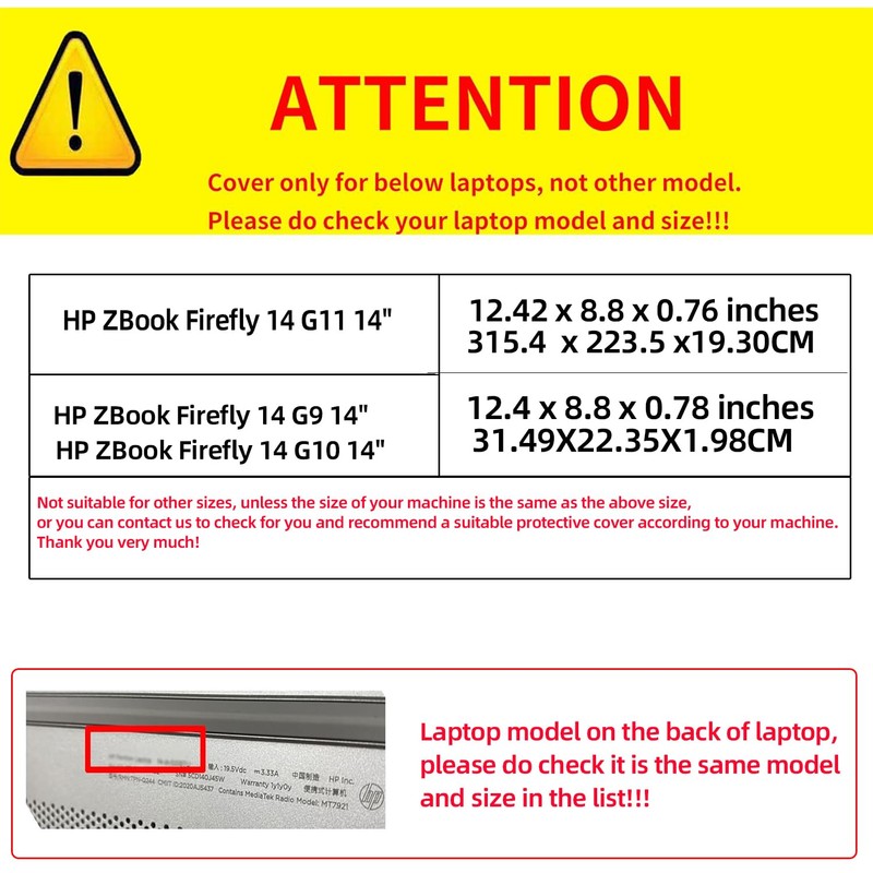 - Compatible models: This cover/shell is only suitable forHP ZBook Firefly 14 G11/ ZBook Firefly 14 G10 / ZBook Firefly 14 G9 14" Mobile Workstation, laptop size: 12.40x8.81x0.78in (315mmx224mmx20mm), 0.34kg, not suitable for any other laptop.