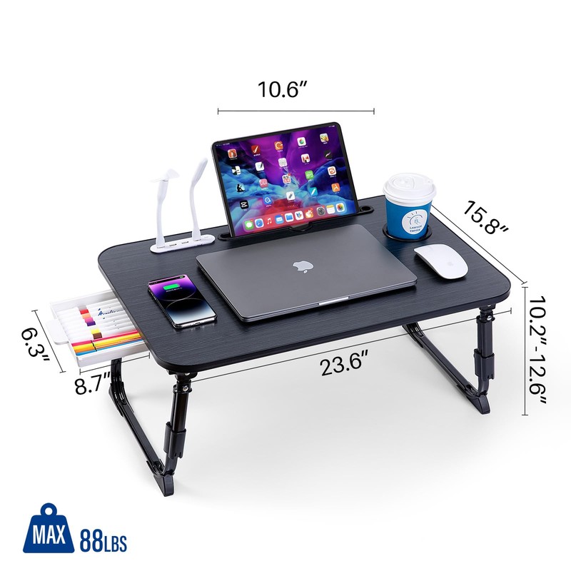 - Portable Laptop Desk with 4 USB Ports: The bed laptop table has foldable legs, You can easily bring the portable laptop table anywhere in bed, on the couch or on the floor to work, write, read and eat breakfast on the laptop bed table, kids can also use it as a study desk to reading, drawing and do homework. The laptop bed table comes with 4 USB ports powered by a 79” USB cable, which can be used to charge a cell phone or desk lamp if necessary. Mini lamp and mini fan included